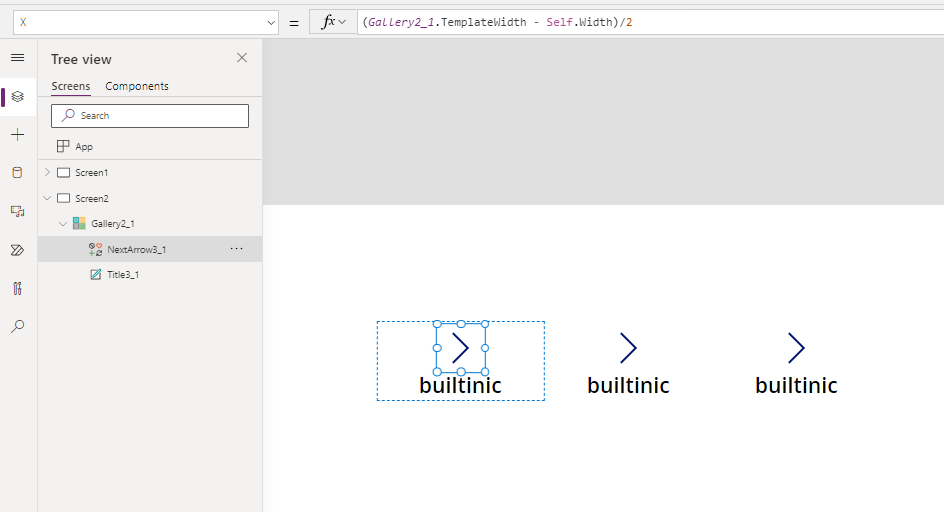Now, let’s move the items in the gallery around. Both the icon and the title of the menu item should be placed exactly in the middle of the template. To do this, you will need to adjust the X property of both the icon and the label to calculate the exact spot. We can do this using a simple formula: