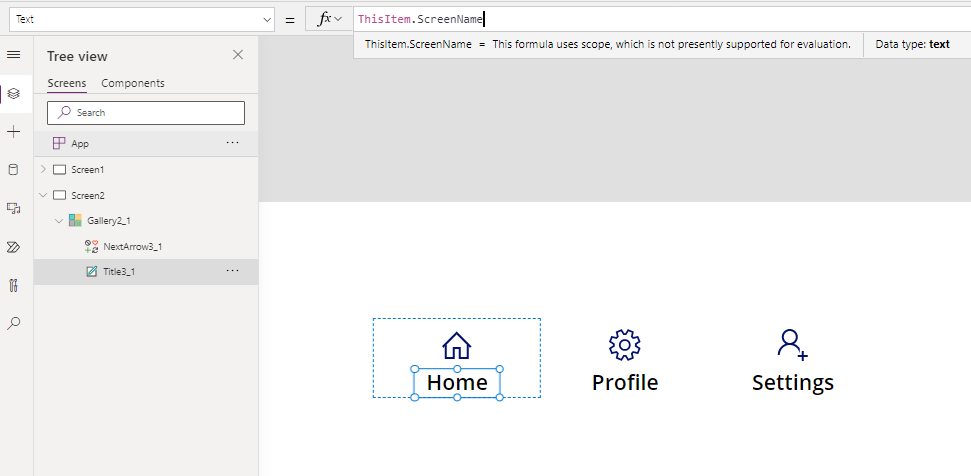 We can now update the Gallery items. Navigate to your Gallery, and then the Items property. We will need to replace the App.ActiveScreen with actual screen names - in our case thatS Home, Profile and Settings.