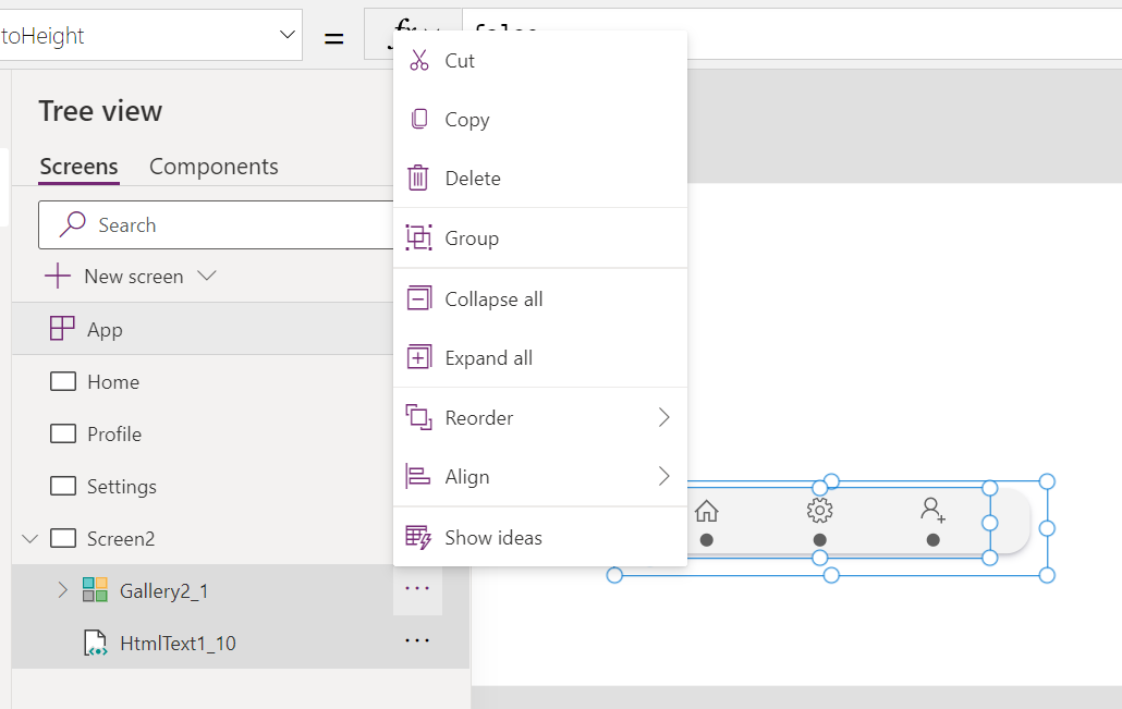 We now need to group the HTML control and the Gallery together (in the later part of this series, we will create an actual component so we won’t need to group these then). Firstly, place the gallery on top of the HTML control.