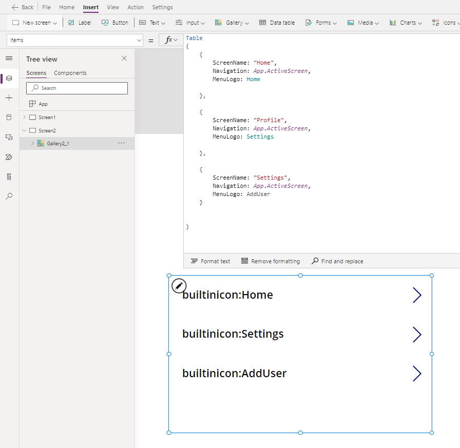 We will then need to provide some items to be displayed in our gallery. To do so, we will construct a very simple table with three items - these will be our menu items. For this post, we will create three screens - Home, My profile and Settings screens. To build the items, we will use the Table() function and create three columns - ScreenName, Navigation and MenuLogo: