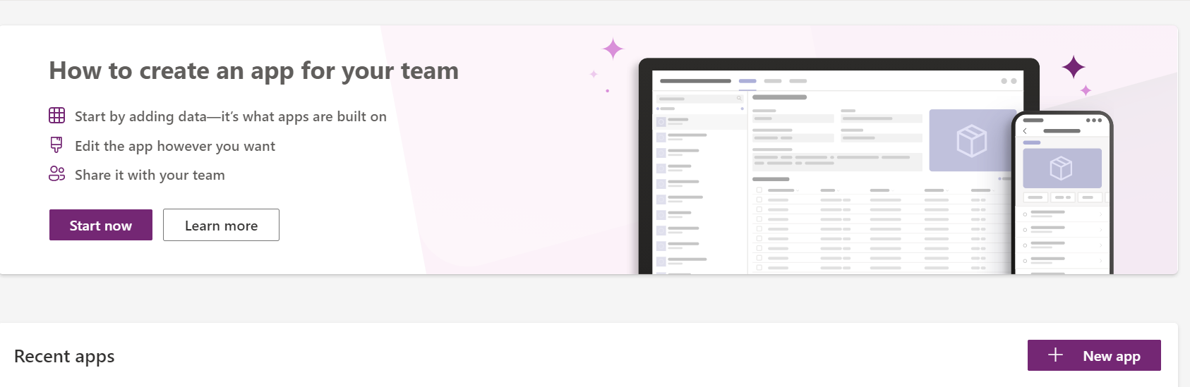 We will then need to create a blank app in Teams. Please click on either ‘Start now’ or ‘New app’, select a Team to add the blank app to, and click ‘Create’.